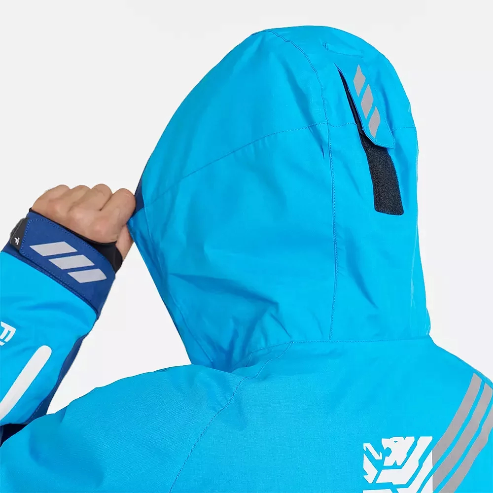 For convenience, the overall has water-resistant zippers along the side seams of the pants, a thigh pocket, and a side pocket, both with waterproof zippers, and a sleeve pocket for a ski pass with a special moisture-wicking material for goggles. The waist area of the overall has belt loops with D-shaped semicircular rings for attaching a snow mobile safity tether. On the left chest is a convenient loop for attaching a two-way radio. Reflective elements on the front and back enhance visibility at dusk.
