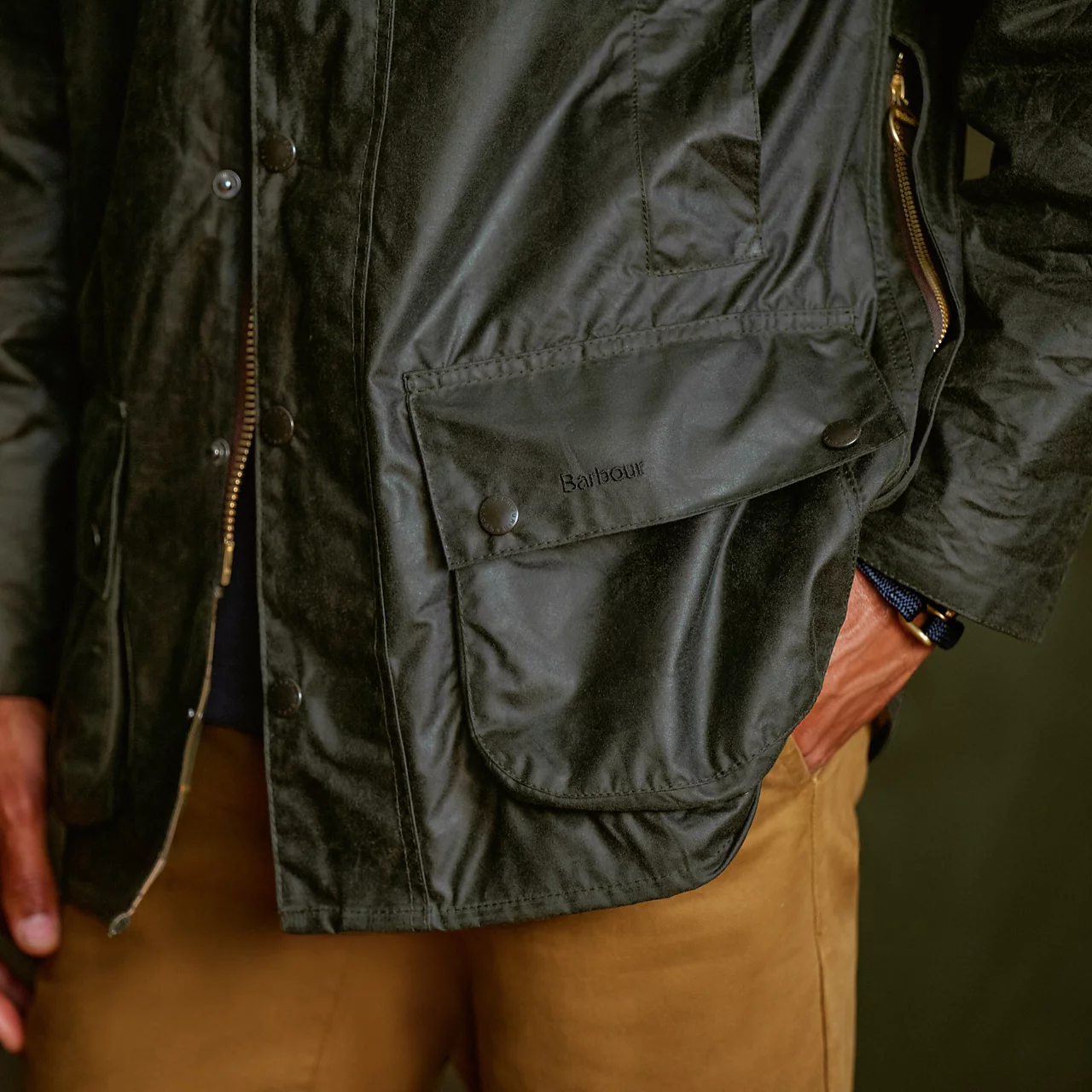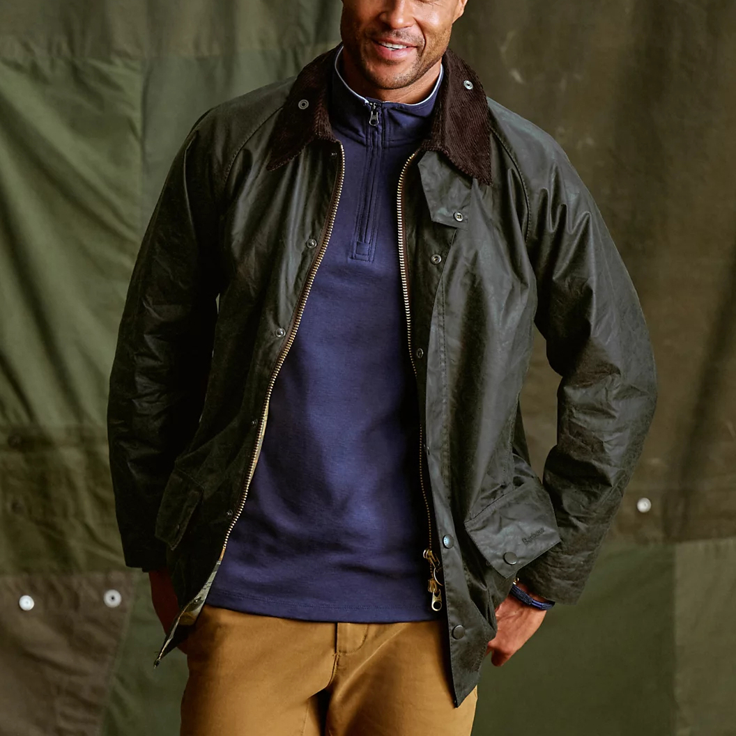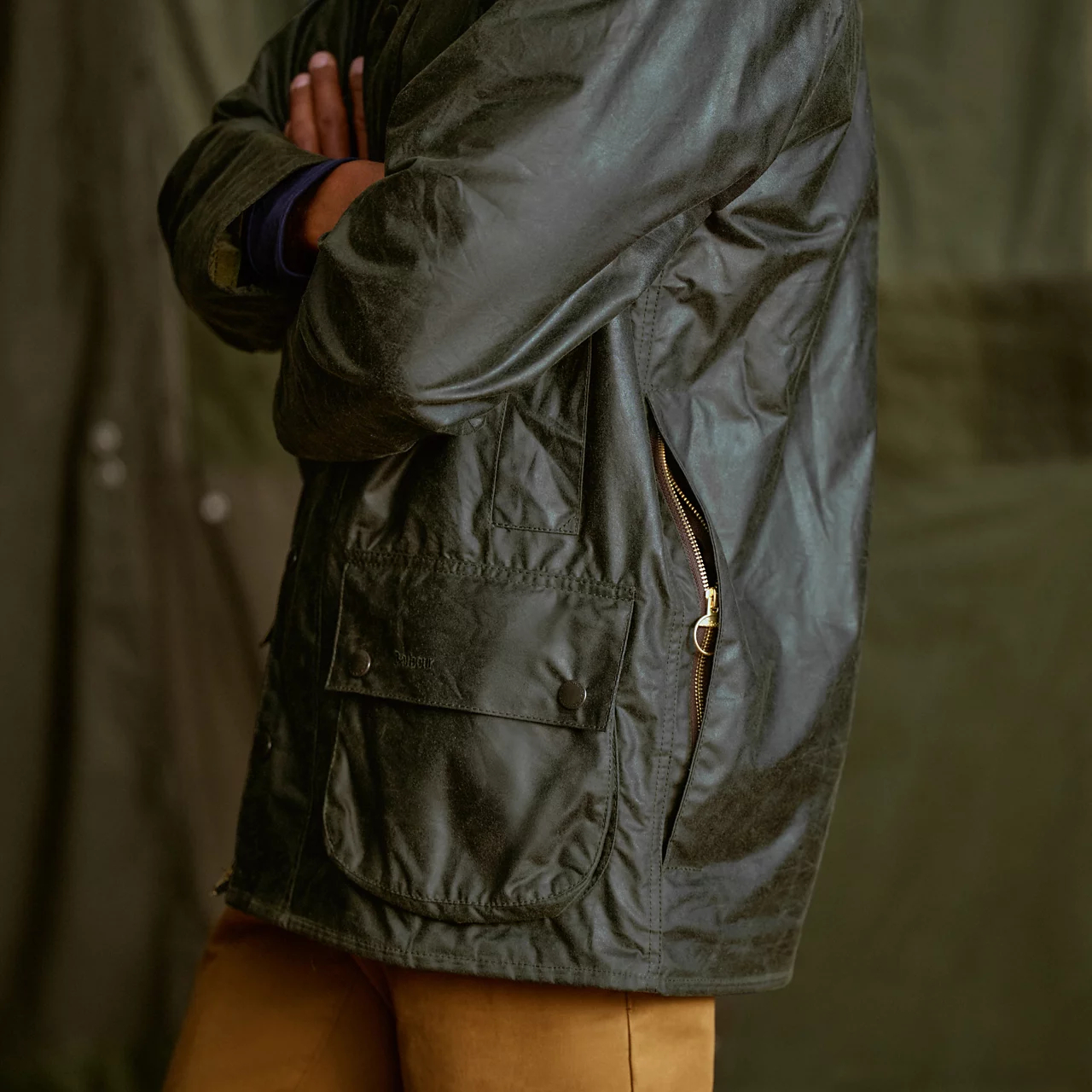 You appreciate the versatility of this medium-weight Barbour waxed jacket.