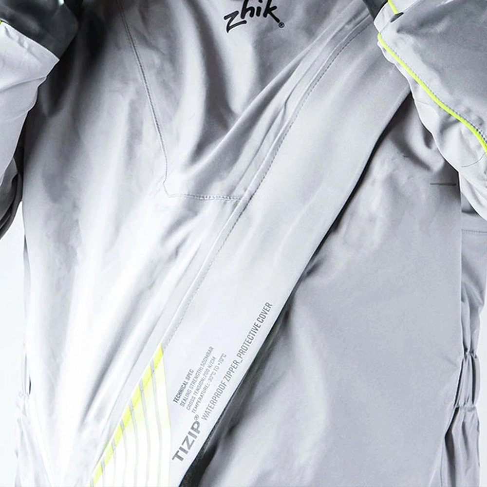 Windproof Moisture-repellent 3-layer fabric Latex cuffs and neck cuffs Breathable DWR coating Fully taped seams Hydrophilic membrane Waterproof TiZip zipper 3-layer Vecta material technology Waterproof, lightweight, and breathable TPU membrane material designed for dinghy sailing Highly breathable with a rating of 10k (mm H2O/g/m2/day) Fully taped critical seams with extra reinforcement Durable water-repellent (DWR) coating.