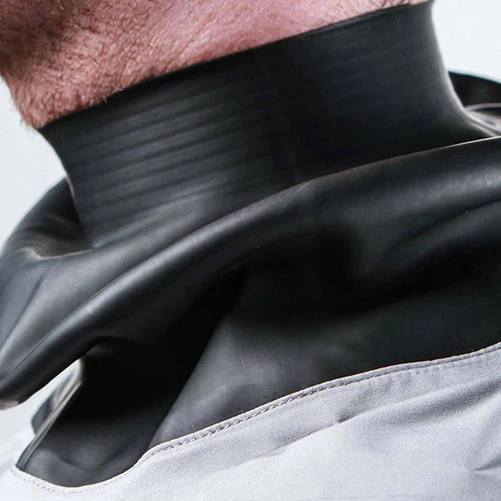 Latex cuffs for maximum comfort and durability German-engineered Tizip® waterproof zipper for maximum waterproofing and durability 450D nylon oxford reinforced panels on knees, back, groin, and feet for maximum durability Asymmetrically positioned zipper for easy entry and exit and easy access to the relief Flow meter pocket device for maximum storage with minimum weight accumulation Protective zipper flap Internal adjustable elastic underwear